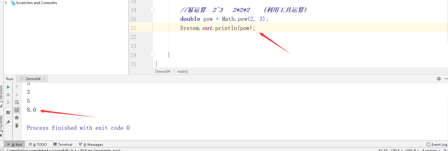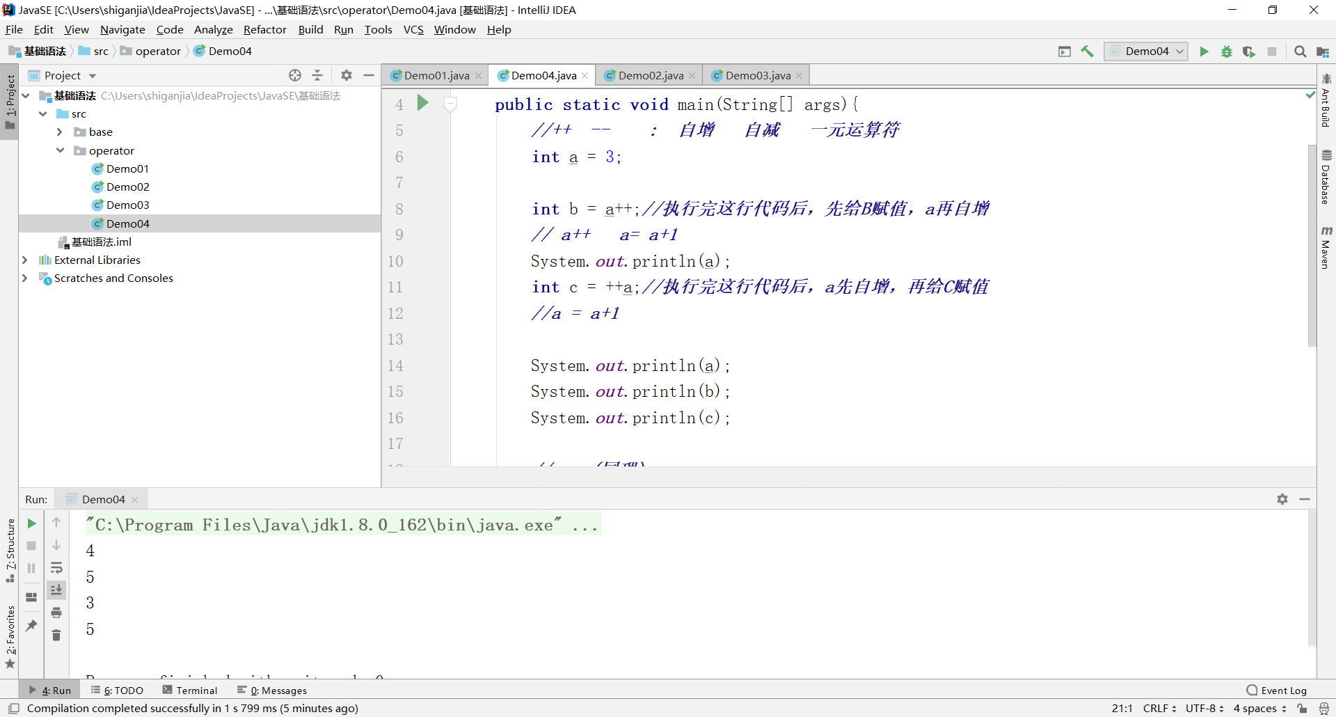 package operator; public class Demo04 { public static void main(String[] args){ //++ -- : 自增 自减 一元运算符 int a = 3; int b = a++;//执行完这行代码后,先给B赋值,a再自增 // a++ a= a+1 System.out.println(a); int c = ++a;//执行完这行代码后,a先自增,再给C赋值 //a = a+1 System.out.println(a); System.out.println(b); System.out.println(c); // --(同理) //幂运算 2^3 2*2*2 (利用工具运算) double pow = Math.pow(2, 3); System.out.println(pow); } }