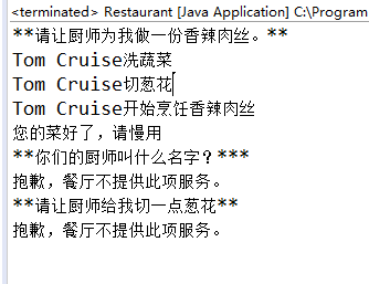 System.out.println("**请让厨师为我做一份香辣肉丝。**");