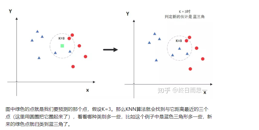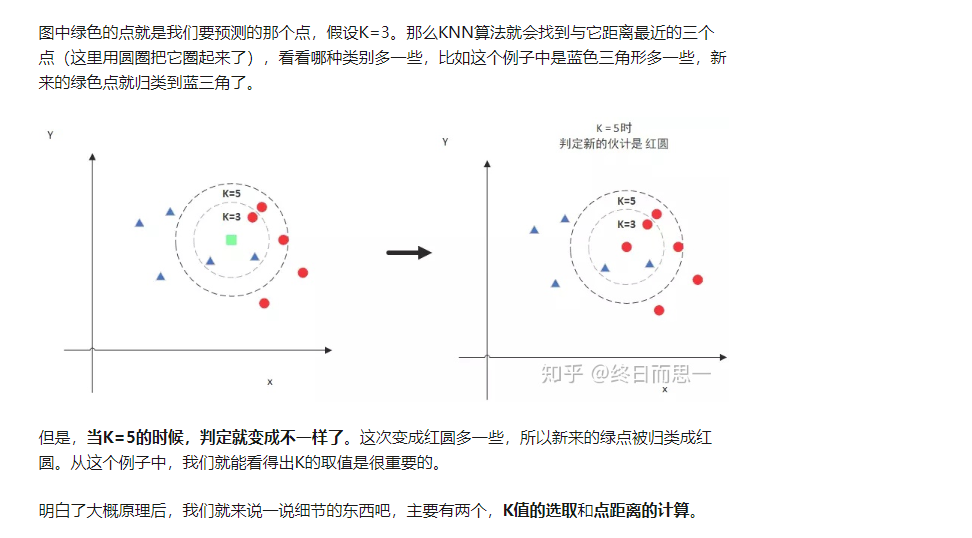 KNN的全称是K Nearest Neighbors,意思是K个最近的邻居,从这个名字我们就能看出一些KNN算法的蛛丝马迹了。K个最近邻居,毫无疑问,K的取值肯定是至关重要的。那么最近的邻居又是怎么回事呢?其实啊,KNN的原理就是当预测一个新的值x的时候,根据它距离最近的K个点是什么类别来判断x属于哪个类别。听起来有点绕,还是看看图吧。