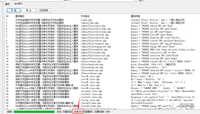 自动审计后,发现有34个可疑漏洞,接下来就得来排查,看有没有的的确确可利用的。