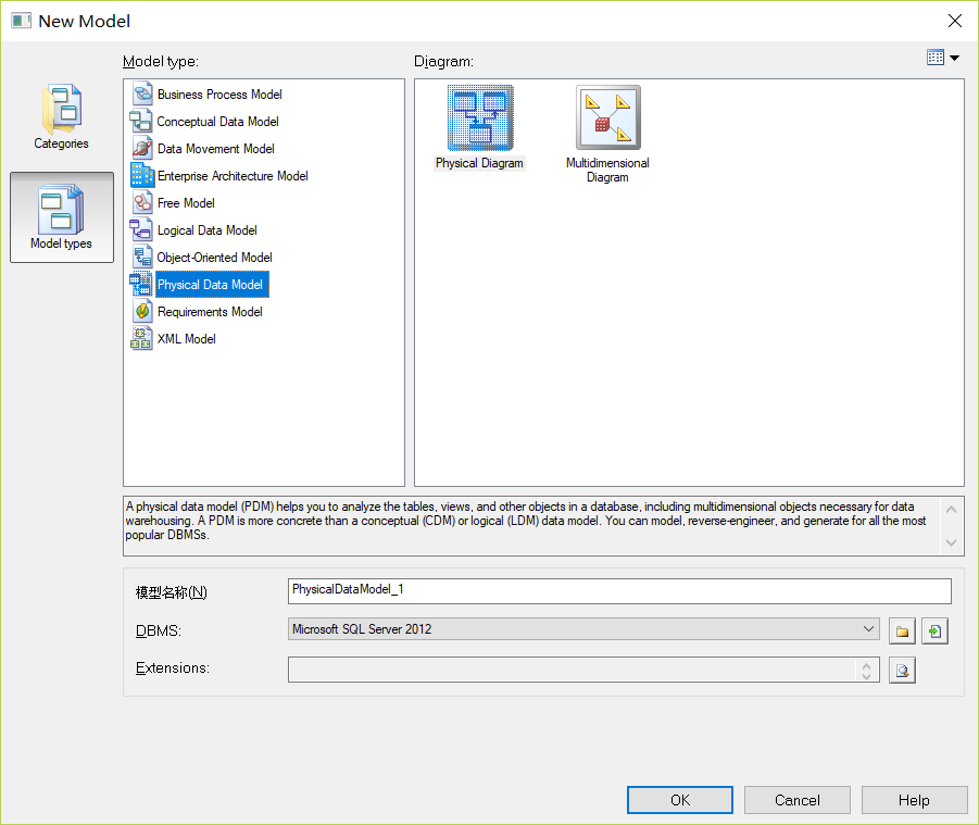 第三步;左键点击Model types,再点击Physical Data model 模型名称要用英文或字母,再点击OK‘建