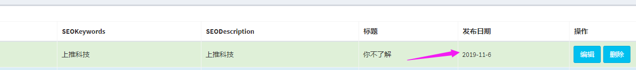 { field: 'SEOTitle', title: 'SEOTitle' }, { field: 'SEOKeywords', title: 'SEOKeywords' }, { field: 'SEODescription', title: 'SEODescription' }, { field: 'FTitle', title: '标题' }, { field: 'FTime', title: '发布日期', formatter: function (value, row, index) { return changeDateFormat(value) } }, { field: 'FId', title: '操作', formatter: operateFormatter //自定义方法,添加操作按钮 },