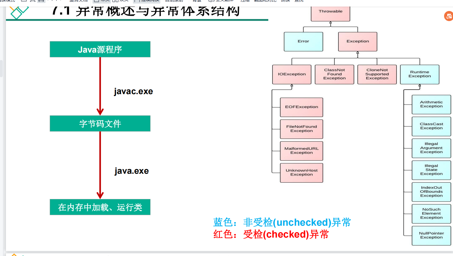 - Exception: 其它因编程错误或偶然的外在因素导致的一般性问题,可以使用针对性的代码进行处理。例如: