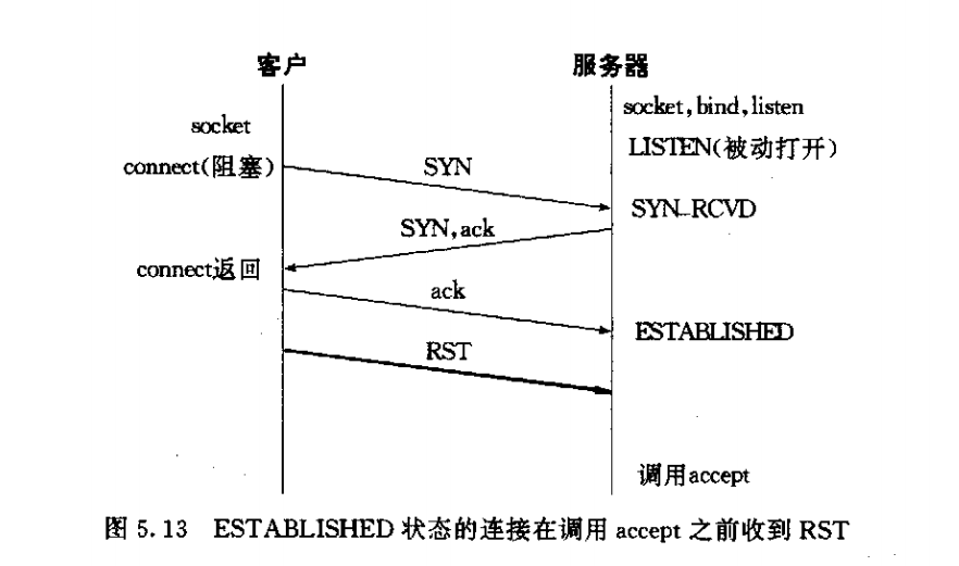 当三TCP路握手完毕从而连接建立之后。客户TCP却发送了RST,在server端看来,就在该连接已由TCP排队,等着server进程调用accept的时候RST到达。