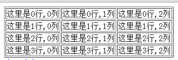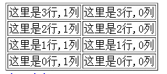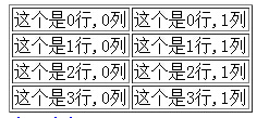 1 window.onload= function createTable4() { 2 var arr = new Array(); 3 arr.push('<table border=1><tbody>'); 4 for (var i = 0; i < 4; i++) { 5 arr.push('<tr>'); 6 for (var j = 0; j < 3; j++) { 7 arr.push('<td>' +"这里是"+ i +"行"+ ',' + j +"列"+ '</td>'); 8 } 9 arr.push('</tr>'); 10 } 11 arr.push('</tbody><table>'); 12 13 document.getElementById('tableTest').innerHTML = arr.join(''); 14 }这时候来看效果的话: