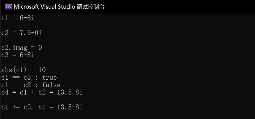 1 #include <iostream> 2 #include "Complex.hpp" 3 4 int main() 5 { 6 using namespace std; 7 8 Complex c1(6,-8); 9 const Complex c2(2.5); 10 Complex c3(c1); 11 12 cout << "c1 = "; 13 c1.show(); 14 cout << endl; 15 16 cout << "c2 = "; 17 c2.show(); 18 cout << endl; 19 cout << "c2.imag = " << c2.get_imag() << endl; 20 21 cout << "c3 = "; 22 c3.show(); 23 cout << endl; 24 25 cout << "abs(c1) = "; 26 cout << abs(c1) << endl; 27 28 cout << boolalpha; 29 cout << "c1 == c3 : " << is_equal(c1, c3) << endl; 30 cout << "c1 == c2 : " << is_equal(c1, c2) << endl; 31 32 Complex c4; 33 c4 = add(c1, c2); 34 cout << "c4 = c1 + c2 = "; 35 c4.show(); 36 cout << endl; 37 38 c1.add(c2); 39 cout << "c1 += c2, " << "c1 = "; 40 c1.show(); 41 cout << endl; 42 }