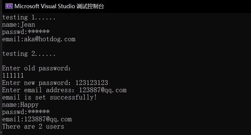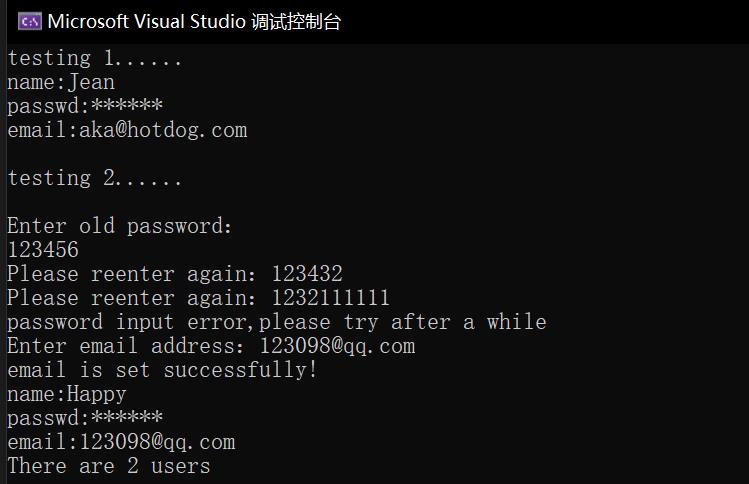 1 #pragma once 2 #pragma once 3 #include <string> 4 #include<iostream> 5 using namespace std; 6 class User 7 { 8 public: 9 User(); 10 User(string name1) :name{ name1 }, passwd{ "111111" }, email{ " " } { 11 n++; 12 }; 13 User(string name1, string passwd1, string email1) 14 :name{ name1 }, passwd{ passwd1 }, email{ email1 }{ 15 n++; 16 }; 17 ~User(); 18 void set_email(); 19 void change_passwd(); 20 void print_info() {cout << "name:" << name << endl 21 << "passwd:" << "******" <<endl 22 << "email:" << email <<endl; 23 }; 24 static void print_n() { 25 cout << "There are " << n << " users" << endl; 26 } 27 private: 28 string name; 29 string passwd; 30 string email; 31 static int n; 32 }; 33 int User::n = 0; 34 35 User::User() 36 { 37 n++; 38 } 39 40 User::~User() 41 { 42 n--; 43 } 44 void User::set_email() { 45 string email1; 46 cout << "Enter email address:" ; 47 cin >> email1; 48 email = email1; 49 cout << "email is set successfully!" << endl; 50 } 51 void User::change_passwd() { 52 int a = 1,n = 2; 53 string passwd1,passwd0; 54 cout << "Enter old password:" << endl; 55 cin >> passwd1; 56 a = passwd1.compare(passwd); 57 while (a != 0&&n--) { 58 cout << "Please reenter again:"; 59 cin >> passwd1; 60 a = passwd1.compare(passwd); 61 } 62 if (a == 0){ 63 cout << "Enter new password:"; 64 cin >> passwd1; 65 passwd = passwd1; 66 } 67 else { 68 cout << "password input error,please try after a while" << endl; 69 } 70 }