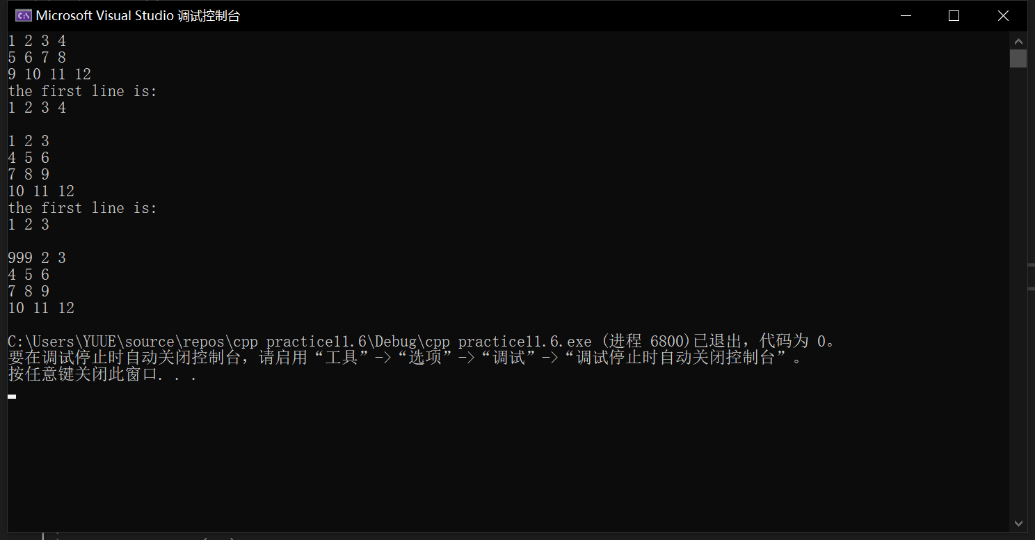 #include <iostream> #include "matrix.hpp" int main() { using namespace std; double x[] = {1, 2, 3, 4, 5, 6, 7, 8, 9, 10, 11, 12}; Matrix m1(3, 4); // 创建一个3×4的矩阵 m1.set(x); // 用一维数组x的值按行为矩阵m1赋值 m1.print(); // 打印矩阵m1的值 cout << "the first line is: " << endl; cout << m1.at(0, 0) << " " << m1.at(0, 1) << " " << m1.at(0, 2)<< " " << m1.at(0, 3) << endl; cout << endl; Matrix m2(4, 3); m2.set(x); m2.print(); cout << "the first line is: " << endl; cout << m2.at(0, 0) << " " << m2.at(0, 1) << " " << m2.at(0, 2) << endl; cout << endl; Matrix m3(m2); m3.set(0, 0, 999); m3.print(); }