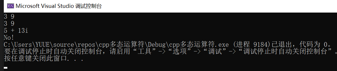 1 #include<iostream> 2 using std::cout; 3 using std::endl; 4 using std::ostream; 5 using std::istream; 6 template <typename T> 7 class Complex { 8 public: 9 Complex(T r = 0, T i = 0) :real{ r }, imag{ i }{} 10 Complex(const Complex<T> &c) : real{ c.real }, imag{ c.imag } {} 11 T get_real() const { return real; } 12 T get_imag() const { return imag; } 13 14 Complex<T> &operator+=(const Complex<T> &obj); 15 16 template <typename T1> 17 friend ostream& operator<<(ostream& out, const Complex<T1> &c1); 18 19 template <typename T1> 20 friend istream& operator>>(istream& in, Complex<T1> &c1); 21 private: 22 T real,imag; 23 }; 24 25 template <typename T> 26 Complex<T>& Complex<T>::operator+=(const Complex<T>& obj) { 27 real += obj.real; 28 imag += obj.imag; 29 return *this; 30 } 31 32 template <typename T> 33 Complex<T> operator+(const Complex<T>& c1, const Complex<T>& c2) 34 { 35 return Complex<T>(c1.get_real() + c2.get_real(), 36 c1.get_imag() + c2.get_imag()); 37 } 38 39 template <typename T> 40 bool operator==(const Complex<T>& c1, const Complex<T>& c2) 41 { 42 return c1.get_real() == c2.get_real() && c1.get_imag() == 43 c2.get_imag(); 44 } 45 46 template <typename T1> 47 ostream& operator<<(ostream& out, const Complex<T1>& c1) { 48 if (c1.imag == 0) 49 out << c1.real; 50 else if (c1.imag > 0) 51 out << c1.real << " + " << c1.imag << "i"; 52 else 53 out << c1.real << " - " << -c1.imag << "i"; 54 return out; 55 } 56 57 template <typename T1> 58 istream& operator>>(istream& in, Complex<T1>& c1) { 59 in >> c1.real >> c1.imag; 60 return in; 61 } 62 int main() { 63 using namespace std; 64 Complex<double> c1(2, 4), c2; 65 cin >> c2; 66 cout << c2.get_real() << " " << c2.get_imag() << endl; 67 c1 += c2; 68 cout << c1; 69 if (c1 == c2) 70 cout << "Yes!"; 71 else cout << "No!"; 72 return 0; 73 }