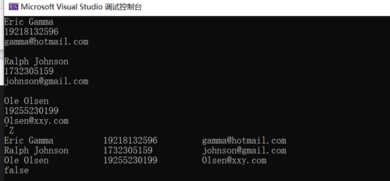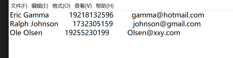 1 #include <iostream> 2 #include <fstream> 3 #include <vector> 4 #include "Person.hpp" 5 6 int main() 7 { 8 using namespace std; 9 10 vector<Person> phone_book; 11 Person p; 12 13 while(cin>>p) 14 phone_book.push_back(p); 15 16 for(auto &i: phone_book) 17 cout << i << endl; 18 19 cout << boolalpha << (phone_book.at(0) == phone_book.at(1)) << endl; 20 21 ofstream fout; 22 23 fout.open("phone_book.txt"); 24 25 if(!fout.is_open()) 26 { 27 cerr << "fail to open file phone_book.txt\n"; 28 return 1; 29 } 30 31 for(auto &i: phone_book) 32 fout << i << endl; 33 34 fout.close(); 35 }