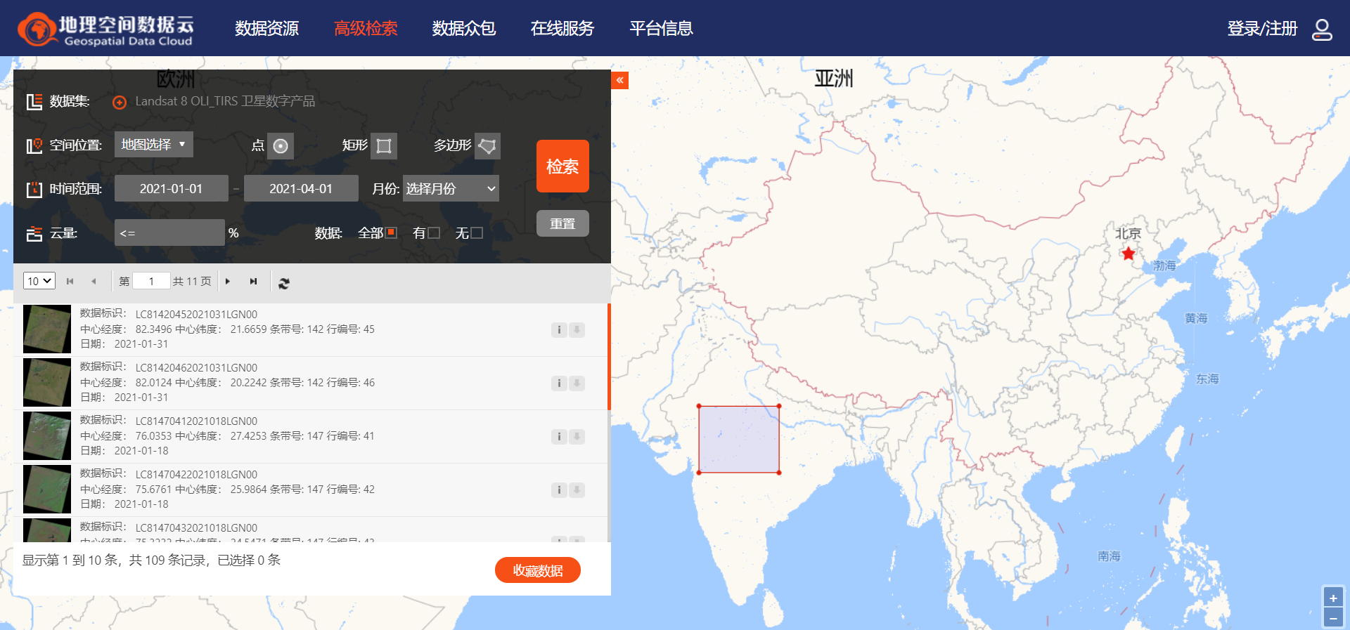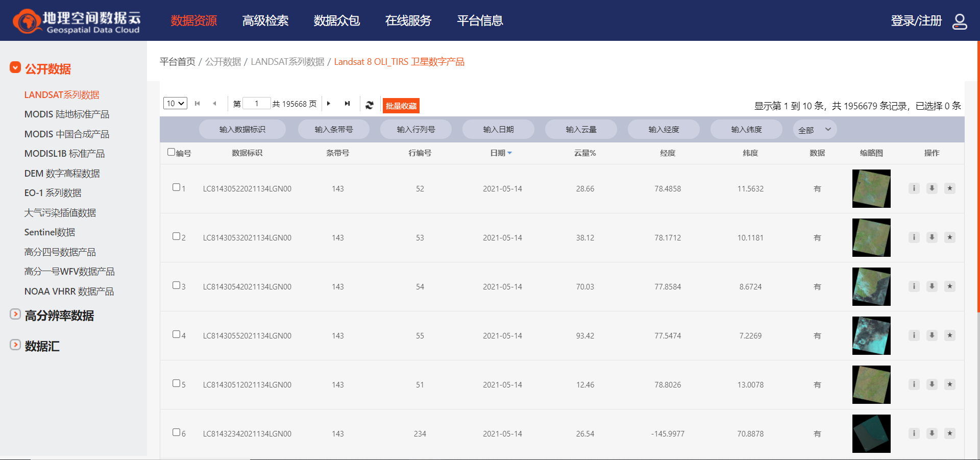 地理空间数据云平台( http://www.gscloud.cn/ )启建于2010年,由中国科学院计算机网络信息中心科学数据中心建设并运行维护。以中国科学院及国家的科学研究为主要需求,逐渐引进当今国际上不同领域内的国际数据资源,并对其进行加工、整理、集成,最终实现数据的集中式公开服务、在线计算等。