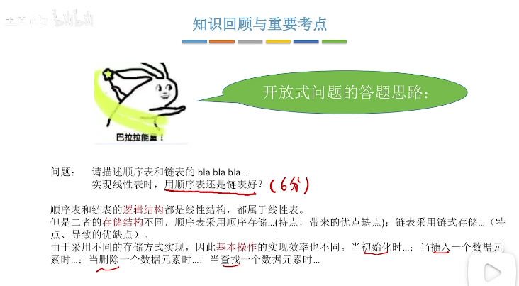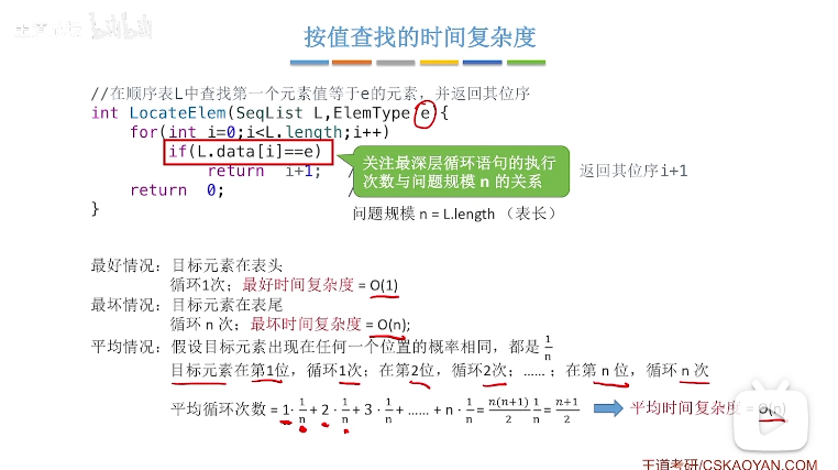 按位:O(1) 按值:O(n),若表内元素有序,课通过其他算法在O(log2n时间内找到) |