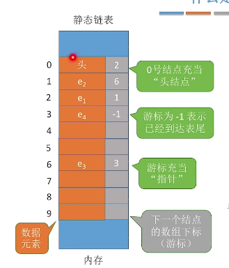 //定义静态链表 #define MaxSize 10 struct Node{ //定义结构类型 ElemType data; int next; //下一个数组的下标 }; void testSLinkList(){ struct Node a[MaxSize];//struct Node型的数组a作为静态链表 }