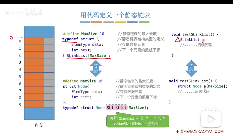 typedef 将struct Node重命名为SLinkList[MaxSize],接下来可以直接定义数组SLinkList a,a就是Node型。