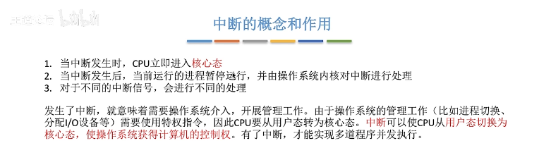 从用户态到核心态,中断时唯一的途径,核心态到用户态的切花是通过执行一个特权指令