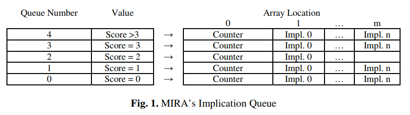 | MIRA uses five separate queues to efficiently implement this heuristic as shown above. Implications are added to each queue depending on their score. (score是?如何计算出来的?)。If an implication has a score of 2, it is inserted into queue 2. The counter variable is then incremented to keep track of the number of implications in that queue. This is true for scores 0 to 3. If the score is higher, it is put into queue 4. Using this queue system, it is easy to insert (only one comparison is needed), reset (reset the length of each queue to 0), or select. Selecting from the queues is simple, as the solver takes a literal from the highest nonempty queue. For queues 0 to 3 it can pick any literal, however, if it chooses queue 4, the solver must search the entire queue for the best choice. |