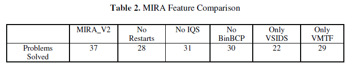 | Table 2 then shows a feature comparison of MIRA. The benchmarks used for this table are the Industrial benchmarks from Table 1. The results of this table were made by disabling one feature from MIRA at a time to see the impact each feature has on performance. The first column is the reference MIRA version with everything enabled solving 37 problems. The next column is with only random restarts disabled and everything else enabled. As can be seen, random restarts help significantly. The No IQS column is MIRA without IQS, and only without it. Next, with the Binary BCP disabled all clauses are processed with the normal BCP procedure slowing things down. The last two columns compare the two decision strategies. When only VSIDS or VMTF is enabled, there are no second decision strategies or implication queue strategies, only the default VSIDS or VMTF is used. First, MIRA’s performance using only VSIDS is very similar to that of zChaff with respect to the number of problems solved. MIRA’s performance with VMTF is very similar to that of Forklift. The point of this table is to show that without all the features enabled, it is very hard to solve over 30 instances. To solve the hard instances, all features must be enabled. |