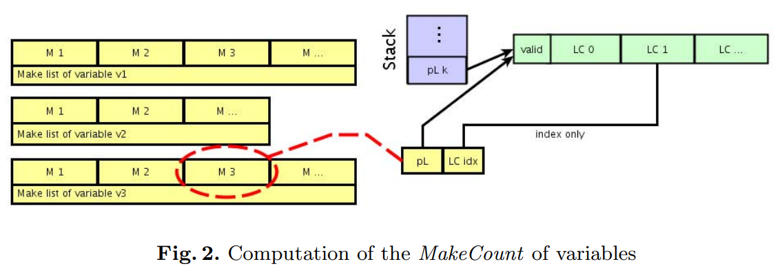 | The realisation of the set D and the data structure to compute MakeCounts of variables follows the concept of lazy data structures and avoids to store complete occurrence lists for literals. MakeCount lists do not require any update operation on backjumping. Even though indices in M become undefined when the referred set L is cleared during backjumping, this is not problematic since an index is only used after L is asserted to be still valid by its flag. |