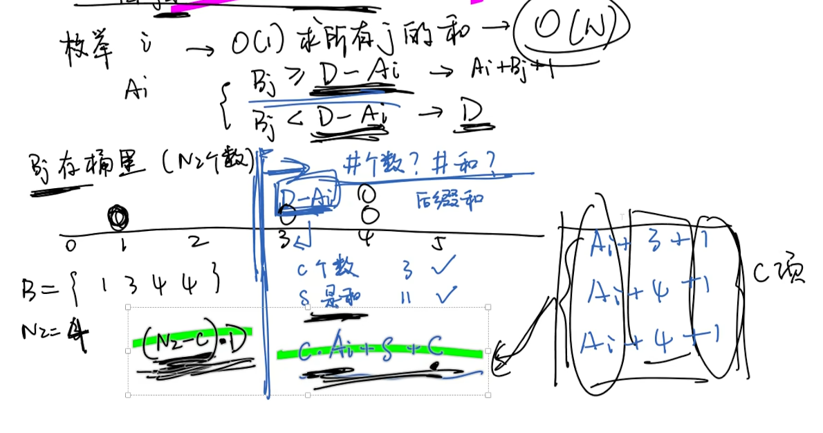 但是,对于每个i都去求和B[j]肯定会T,注意这里是值域,如果存在某个值使得对于每个i,都有 Ai + Bj + 1 > D,那么>B[j]的所有值天然不可能选择D