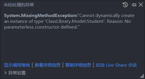 这个再使用上面的创建对象方式就会报错。会提示没有找到无参数的构造函数。