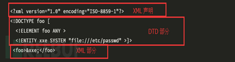 <!ENTITY xxe(实体引用名) SYSTEM "file:///etc/passwd"(实体内容) >]>