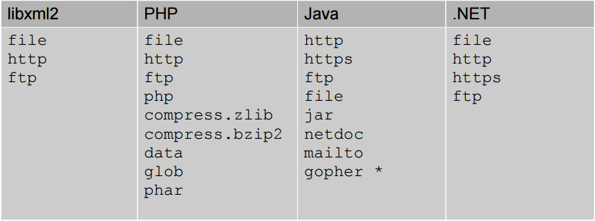 - XML中对数据的引用称为实体,实体中有一类叫外部实体,用来引入外部资源,有SYSTEM和PUBLIC两个关键字,表示实体来自本地计算机还是公共计算机,外部实体的引用可以借助各种协议,比如如下的三种: