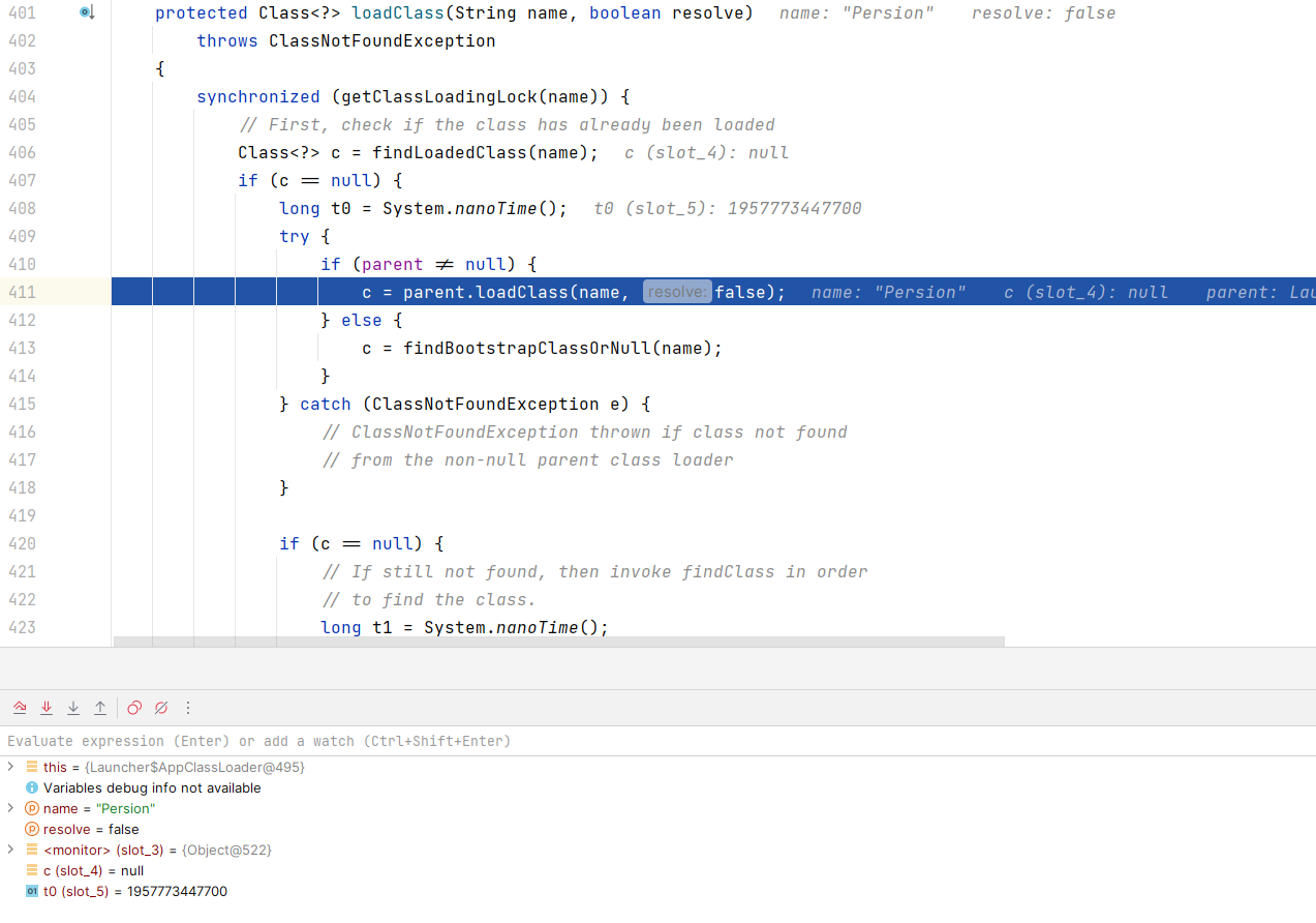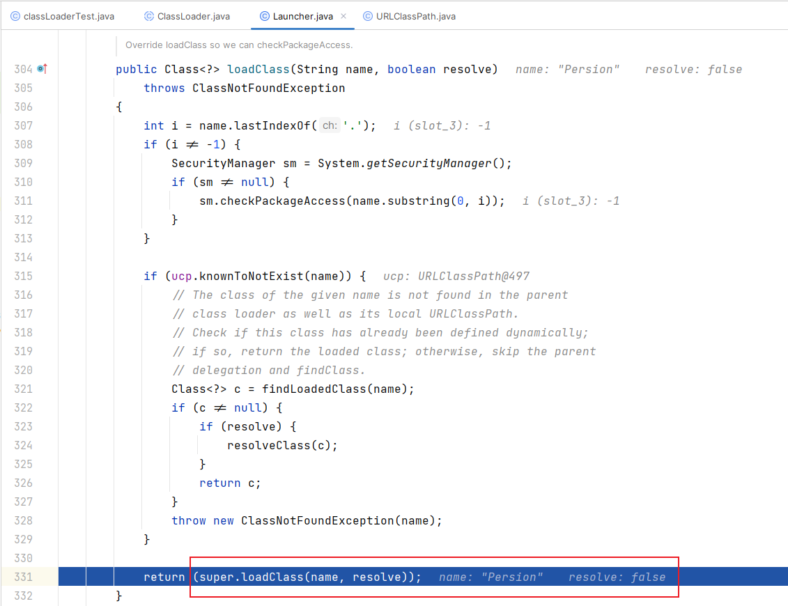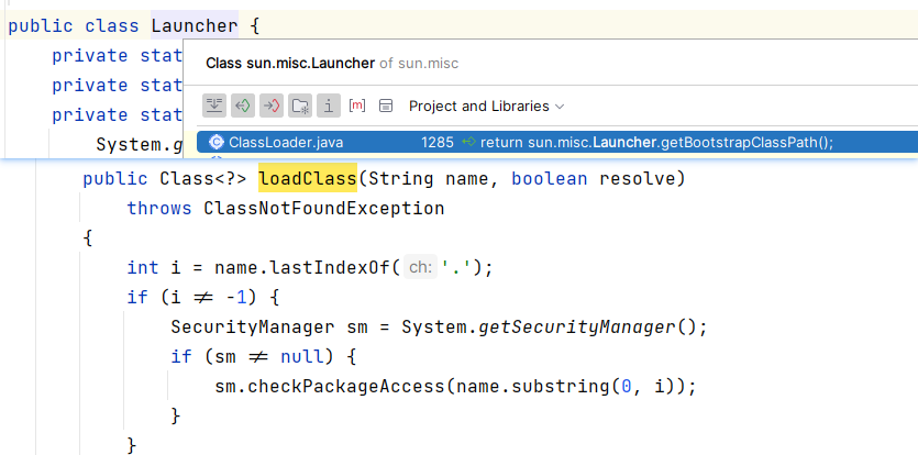 - 由于传入的是一个参数,它会调用到本应该调用的是Launcher类中的loadClass方法,但是它斌没有接收一个参数的loadClass方法,就会去调用父类的loadClass方法