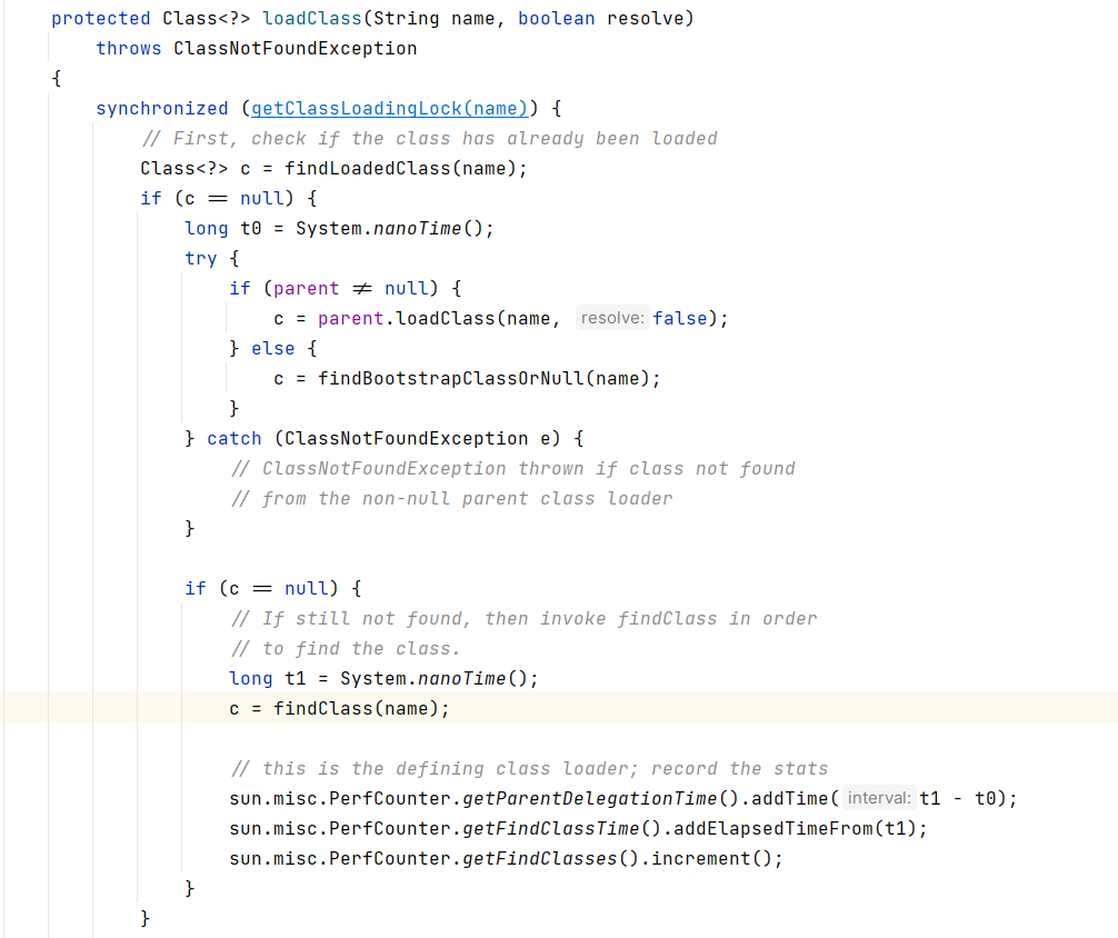 - 程序退回到ClassLoader.loadClass()判断处,继续往下执行