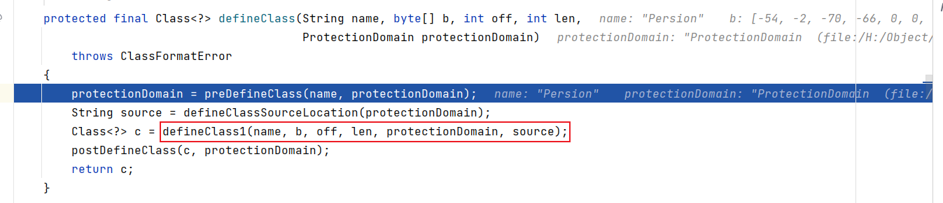 最终在ClassLoader中的defineClass停止,它又执行了一个defineClass1(),它的definClass()方法中可以看到存在5个参数,第一个是类名、第二个参数是字节码、第三个参数是起始位置、第四个是长度、第五个是保护域