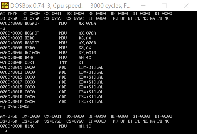 data2, data3对应的内存空间,确认逐一相加后,结果的确保存在了逻辑段data3中。