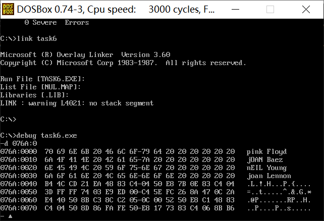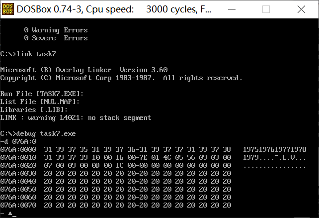① 在debug中将执行到line17结束、line19之前,记录此时:寄存器(DS) = _076AH___, 寄存器(SS) =