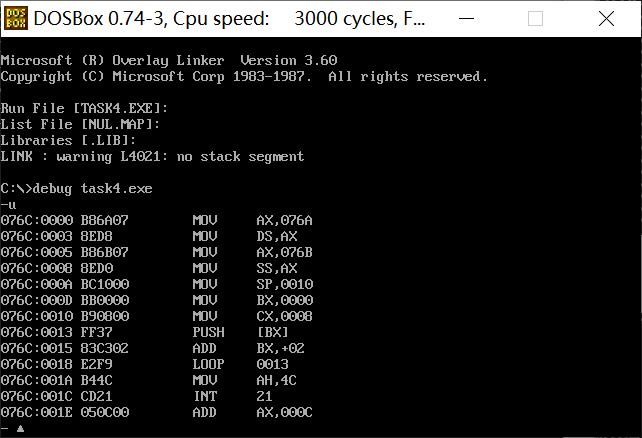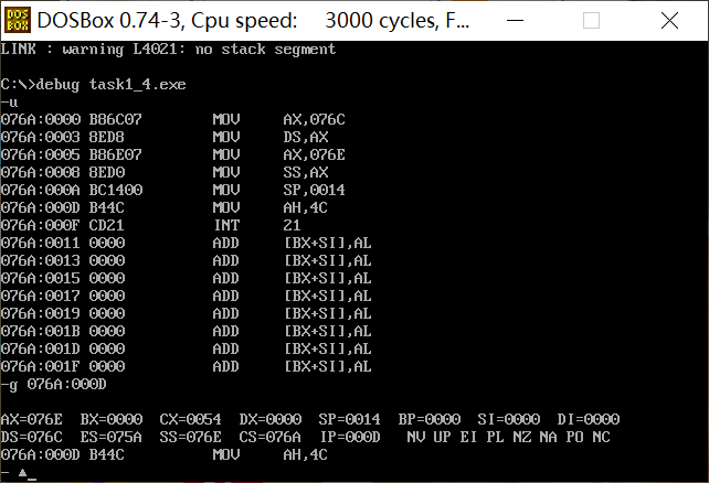 对程序task1_4.asm进行汇编、连接,用debug加载、跟踪调试,基于结果,回答问题。