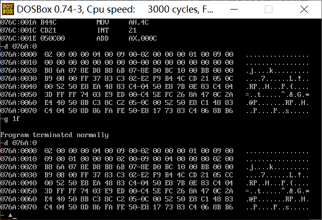 ② 在debug中加载程序,反汇编,执行到line13退出前,用d命令查看data段对应的内存空间,确认每行第一个单词已经由大写->小写。