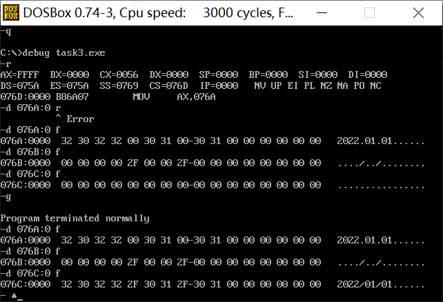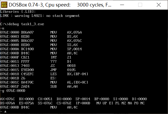 对程序task1_3.asm进行汇编、连接,用debug加载、跟踪调试,基于结果,回答问题。