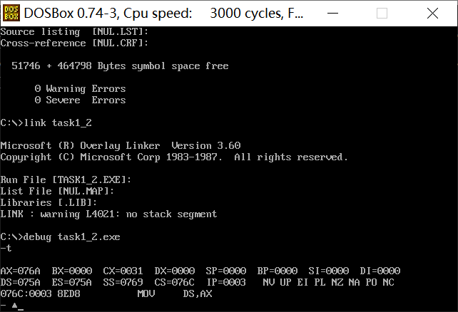 对程序task1_2.asm进行汇编、连接,用debug加载、跟踪调试,基于结果,回答问题。