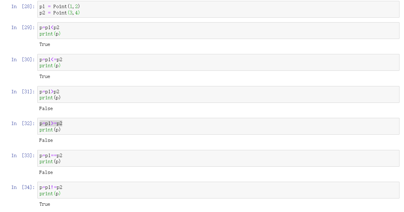 import math class Point(): def __init__(self,x,y): self.x = x self.y = y def __lt__(self, other): l1 = math.sqrt(self.x**2+self.y**2) l2 = math.sqrt(other.x**2+other.y**2) return l1<l2 def __le__(self, other): l1 = math.sqrt(self.x**2+self.y**2) l2 = math.sqrt(other.x**2+other.y**2) return l1<=l2 def __gt__(self, other): l1 = math.sqrt(self.x**2+self.y**2) l2 = math.sqrt(other.x**2+other.y**2) return l1>l2 def __ge__(self, other): l1 = math.sqrt(self.x**2+self.y**2) l2 = math.sqrt(other.x**2+other.y**2) return l1>=l2 def __eq__(self, other): l1 = math.sqrt(self.x**2+self.y**2) l2 = math.sqrt(other.x**2+other.y**2) return l1==l2 def __ne__(self, other): l1 = math.sqrt(self.x**2+self.y**2) l2 = math.sqrt(other.x**2+other.y**2) return l1!=l2 p1 = Point(1,2) p2 = Point(3,4) p=p1<p2 print(p) p=p1<=p2 print(p) p=p1>p2 print(p) p=p1>=p2 print(p) p=p1==p2 print(p) p=p1!=p2 print(p)