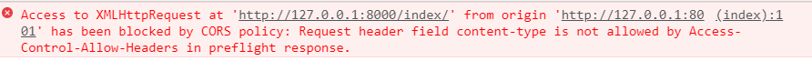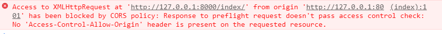def index(request): res = HttpResponse(123) # res['Access-Control-Allow-Origin'] = '*' res['Access-Control-Allow-Origin'] = 'http://127.0.0.1:8001' return res