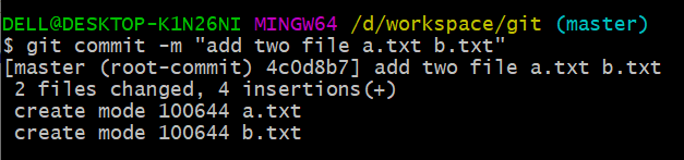 (2)再执行git commmit 命令,输入:git commit -m "add two file a.txt b.txt",即成功提交到本地库,如图所示
