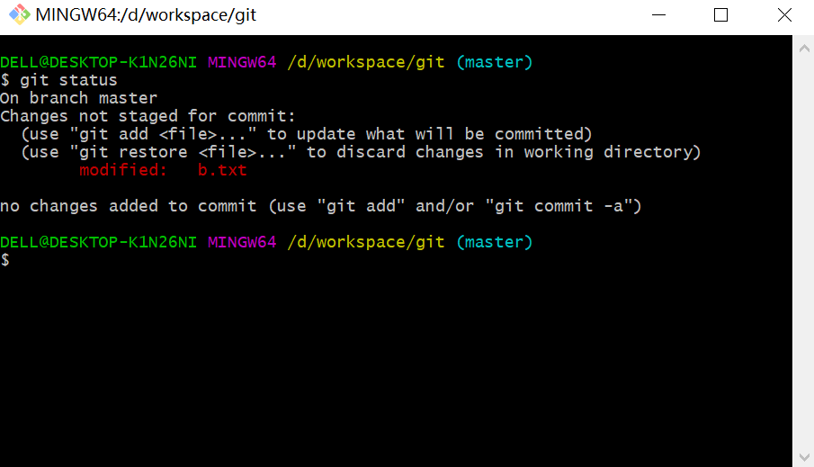 输入git status查看到b.txt被修改
