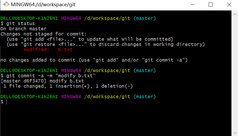 (4)输入git commit -a -m "modify b.txt",即将修改的文件也提交到本地库