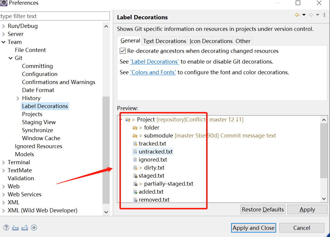 可在Eclipse中查看window-->Team->Git->Label Decorations