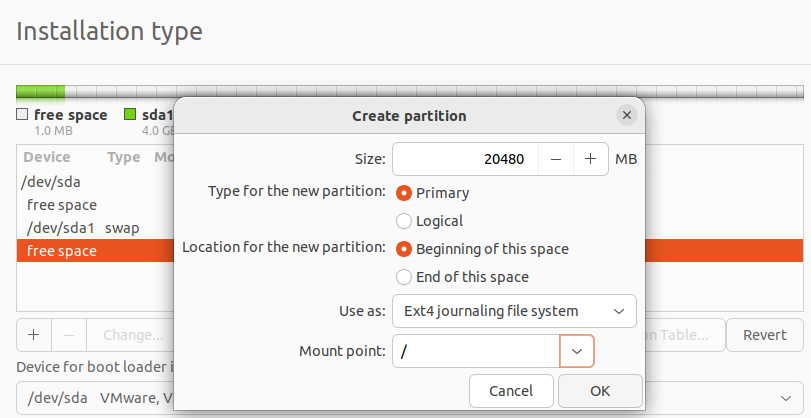 为root文件系统创建分区。root 文件系统包含内核、引导和系统文件、命令行实用程序、系统范围的配置和日志文件。 (10-20GB)