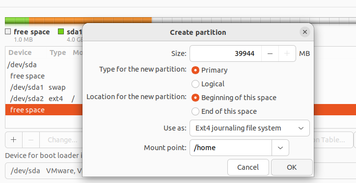 为用户文件系统做一个分区。/home目录包含所有用户的文档、图像和视频。 重新安装 Ubuntu 时,这有助于保留这些用户文件。