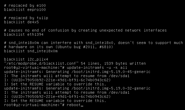 光标移到最后一个字符上,按a, 回车 , 输入blacklist i2c_piix4