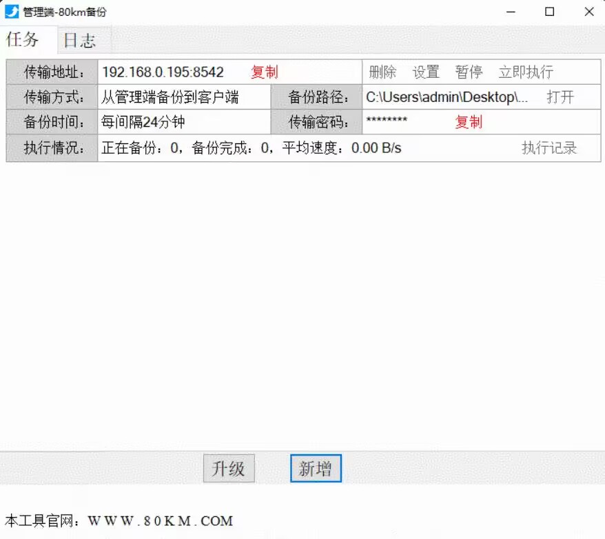 步骤:感觉界面点新增,不管选择从管理端备份到客户端,还是从客户端备份到管理端,默认是从管理端备份到客户端。选择当前的备份路径选择该选的,传输地址、线程、传输密码等等。