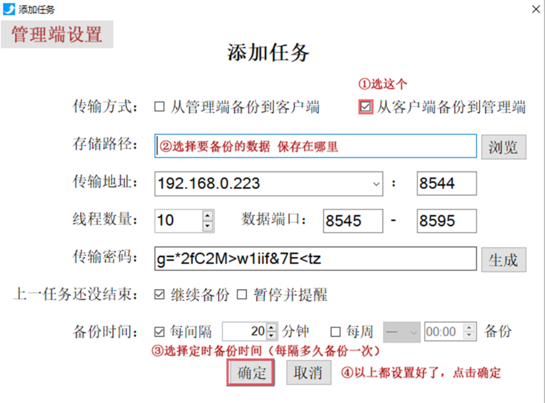 因为我们是要从B电脑备份到A,而A就是管理端。所以选择“从客户端备份到管理端”,存储路径,就是要保存到A的什么地方。如:D:\备份\,传输密码,建议点一下生成。设置备份时间,点击确定。选择好后,点确定,则任务建立完成(注意:一个任务对应一个存储路径,我们备份多台电脑(服务器)为方便区分,则需要建立多个任务)