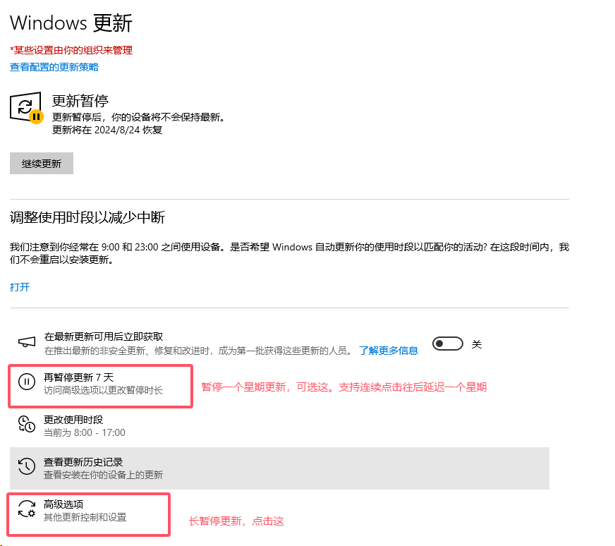 在这里,您可以找到“暂停更新”的选项,选择暂停时间,以暂时停止自动更新。但请注意,