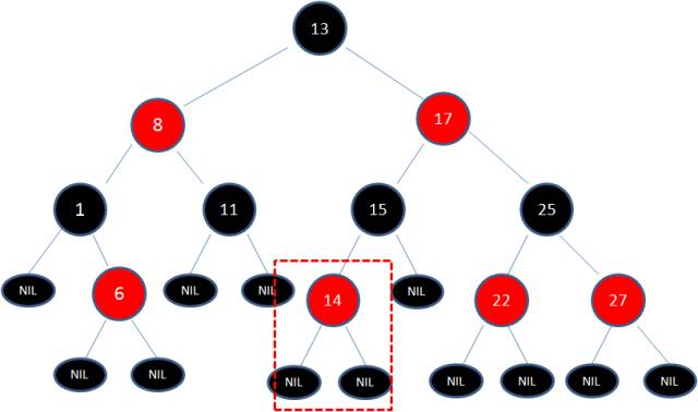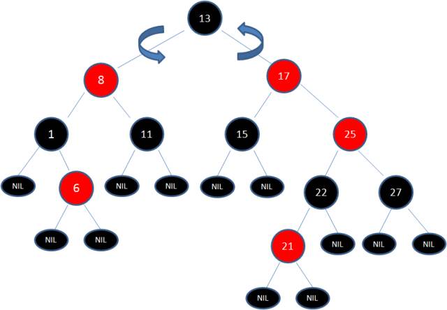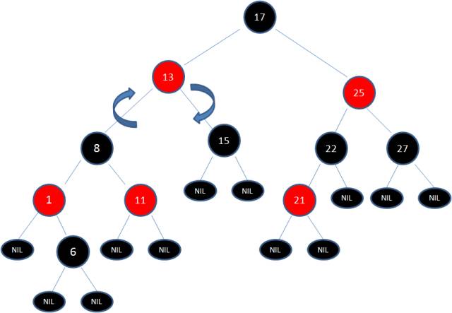 此时节点17和节点25是连续的两个红色节点,那么把节点17变成黑色节点?恐怕不合适。这样一来不但打破了规则4,而且根据规则2(根节点是黑色),也不可能把节点13变成红色节点。